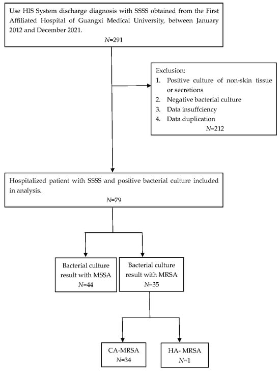 A retrospective analysis of 291 patients with SSSS treated at our hospital from 1 January 2012, to 31 December 2021, was performed using the hospital information system (HIS). All newly admitted patients without prior antibiotic use whose skin and soft tissue secretion samples were collected within 24 h of admission were selected for further investigations. Patients with negative secretion cultures were excluded. Seventy-nine strains of S. aureus were successfully isolated and cultured, including 35 MRSA isolates and 44 MSSA isolates. The exclusion criteria were as follows: (1) repeated results from the same patient, with the first samples with a positive culture retained; (2) samples that were possibly contaminated and not secreted by skin and soft tissues, such as urine and blood; (3) samples that were not submitted for examination in a timely manner (within 2 h); and (4) data from patients with incomplete medical records. We defined HA-MRSA and CA-MRSA infections according to the recommendations of the CDC and Naimi et al. [27,28]. HA-MRSA patients were defined as patients who (1) had a MRSA infection detected 48 h after admission; (2) had a history of hospitalization, surgery, dialysis, or long-term care facility residence within 1 year from the date of MRSA culture; (3) had a permanent presence of MRSA infection at the time of culture with an indwelling catheter or percutaneous medical device; or (4) had previous positive MRSA culture results during the study period. All other patients were classified as having CA-MRSA.