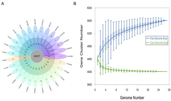 Pan-genome analysis of the Salmonella Paratyphi B genome. (A) Flower plot of 27 Salmonella Paratyphi B genomes showing the gene content of the core genome (center), the accessory genome (around the center), and strain-specific genes (petals). (B) Progressive curves for the core and pan-genome were estimated for all 27 genomes. Curves show the downward trend of the core gene families and the upward trend of the pan-gene families with additional genomes.