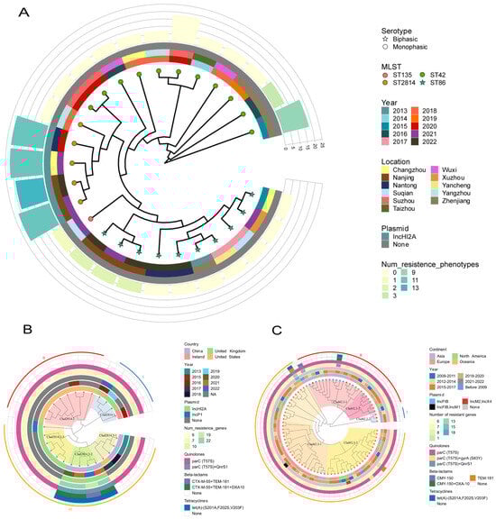 Phylogenetic trees reconstructed from SNP data using the maximum likelihood method. (A) Phylogenetic tree of 27 strains of Paratyphi B in Jiangsu province, ○ and ☆ on the node represent monophasic and biphasic separately; the colors represent different MLST; and, from the inner circle to the outer circle—the first circle represents the year of the isolation of the strains, the second represents the region where the strains were isolated, the third represents the presence or absence of the plasmids, and the height and color of the fourth circle represent the number of resistance genes and the resistance phenotype, respectively. (B) Phylogenetic tree of 26 ST2814 strains worldwide; the colors on the node represent the strains isolated in the province (green) and the downloaded strains (red); and, from the inner circle to the outer circle—the first circle adjacent represents the country in which the strain was isolated, the second represents the year of isolation, the third represents the year of plasmid replicon isolation, the fourth represents the number of resistance genes, and the fifth, sixth, and seventh circles represent the carriage of quinolone, beta-lactam, and tetracycline resistance genes, respectively. (C) Phylogenetic tree of 85 ST42 strains from all over the world, and the colors on the node represent the isolates from this province (blue) and the downloaded strains from other parts of China (green) and the downloaded non-Chinese strains (red). The first circle indicates the continent where the strain was isolated, and the other circles represent the same meanings as in Figure 2B.