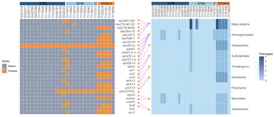 A total of 36 resistance genes were identified across the 27 strains, falling into ten categories based on their antibiotic target. Most strains exhibited good concordance between their resistance genotypes and phenotypes (Figure 3). XDR strains harbored eight categories with 20–23 genes, while MDR strains carried seven classes with 18 genes. Other resistant strains carried only six to eight genes. However, ST2814 and ST42 isolates from other areas of the world harbored significantly fewer resistance genes, averaging only seven per strain with a maximum of 13, this stood in stark contrast to our regional finding of XDR and MDR strains exceeding 18 genes (Figure 2B,C). Additionally, the presence of Salmonella genomic islands (SGI1, SGI1-K, and SGI2) was not observed across all tested strains.