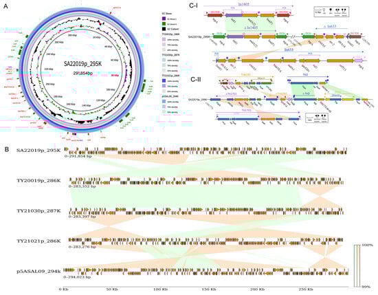 Comparative genome and linear analysis of XDR plasmids. (A) Comparative genome map of five plasmids with SA20019p_295K in the center of the map, and TY20019p_286K, TY_21030p_287K, TY21021p_286K, and p5ASAL09_294k as the circles from the inner to the outer; the annotated genes on the outer-most layers are the resistance genes (red), integrase genes (blue), and conjugation-related genes (green) of SA22019p_295K; the shades of the circles represent the sequence similarity between the four plasmids and SA20019p_295K, respectively. (B) Full-length linear analysis of the five plasmids, with green representing the forward-sequence similarity, yellow representing the reverse-sequence similarity, and the color shade representing the sequence similarity percentage. (C) Linear comparison of the SA20019p_295K XDR regions with In1405, In633 (I), Tn6292, truncated Tn1721, and truncated Tn2 (II), with green representing the forward-sequence similarity, yellow representing the reverse-sequence similarity, and the color shade representing the sequence similarity percentage.