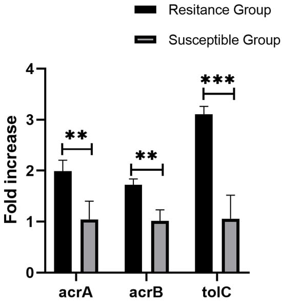 Average expression levels of acrA, acrB, and tolC genes in ramAp harbored strains, values on the y-axis are relative expression levels (fold increase) normalized against levels of the endogenous reference rpoB. The data correspond to the mean values of three biological replications. Error bars correspond to the standard deviation. Asterisks indicate statistically significant differences (** indicate p < 0.01, *** indicate p < 0.001) in student t-tests.