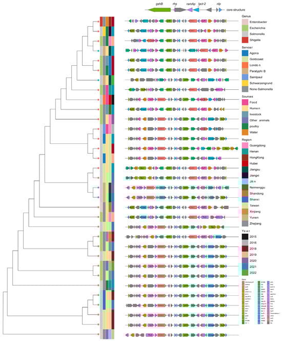 Comprehensive information and evolution relationship among 33 ramAp-bearing plasmids. Plasmids were colored according to genus, serotype (if the strain belongs to Salmonella Genus), collection source, collection provinces, collection year, and genetic context of ramAp from left to right.