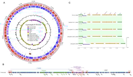 ICESml1512 structure and MDR region analysis. (A) Structure of TY1512 chromosome and ICESml1512 localization; (B) fundamental structure of ICESml1512, with green representing integrative, conjugative related genes and purple representing drug resistance genes; (C) linear analysis of the ICESml1512 MDR region with MDR regions from the Klebsiella quasipneumoniae (S174-1.1), Escherichia coli (pM171-1.2), Klebsiella pneumoniae (pHN11RT-4), and Salmonella Typhimurium (p453) plasmids, with the color shades representing sequence similarity.