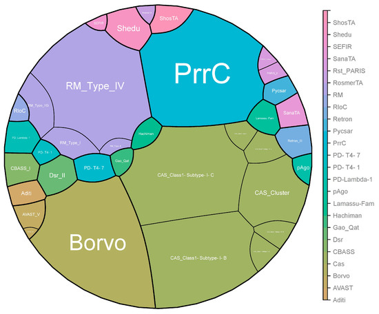 Voronoi treemaps of antiphage defense system distribution. In total, we identified 24 antiphage systems. Four major antiphage systems are present in the vast majority of strains, namely Cas, PrrC, Borvo, and R-M. The image was generated using SrPlot (https://www.bioinformatics.com.cn/, accessed on 12 January 2024). Voronoi treemaps visualize hierarchical data by recursively partitioning convex polygons using weighted centroidal Voronoi diagrams. The polygon areas are proportional to the relative weights of their corresponding nodes. The size of each polygon indicates the frequency of the corresponding antiphage system. The clustering within the treemap represents the hierarchical relationships among different antiphage systems, and the color scale is used to differentiate between various systems and their prevalence.