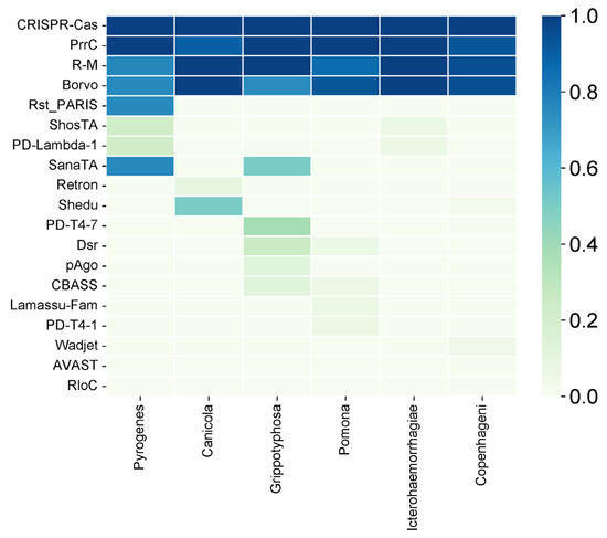 We also analyzed the diversity of the antiphage systems depending on the serovar (Figure 3). The following six main serovars were considered: Pyrogenes, Canicola, Grippotyphosa, Pomona, Icterohaemorrhagiae, and Copenhageni. Among all of the antiphage systems that have been identified, the Cas system is present in all serovars. This shows that it is widely used as a defense mechanism. Similarly, the PrrC system has high prevalence, being present at 90% or more in all serovars except Pyrogenes, where it is observed at a 100% frequency.