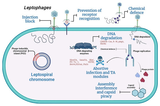 General outline of leptospiral defense strategies targeting different stages of the leptophage cycle. Leptospira strains possess various anti-leptophage systems, such as CRISPR-Cas, R-M, pAgo, and Shedu, which affect DNA degradation. Additionally, they exhibit antiphage systems that lead to abortive infection, as exemplified by Borvo and Shosta. The images were generated using BioRender (https://www.biorender.com, accessed on 12 January 2024).