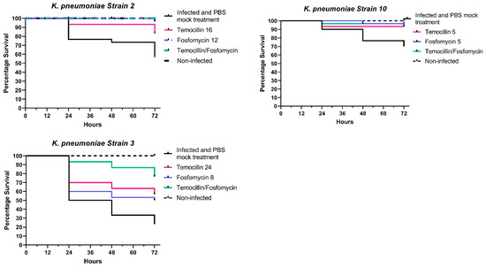 Larvae infected with K. pneumoniae isolate 1 and treated with a combination of temocillin and fosfomycin exhibited a survival rate of 96.6% compared to 90% for fosfomycin alone, and 73.3% for temocillin alone (p = 0.0252, n = 30). In larvae infected with K. pneumoniae isolate 2, a combination of both antimicrobials resulted in a 100% survival rate, relative to an 86% survival rate for temocillin monotherapy. Fosfomycin monotherapy led to a 93% survival rate, with only a single larva succumbing to challenge at 72 h post-infection. K. pneumoniae isolate 3 elicited 90% mortality; however, the combination of temocillin at 24 and fosfomycin at 8 significantly improved the survival rate relative to 86% relative to temocillin alone 63% (p = 0.0768, n = 30), or fosfomycin alone 53% (p = 0.0205, n = 30). Combination treatment of larvae infected with K. pneumoniae isolate 4 resulted in a survival rate of 90% compared to a survival rate of 46% without antibiotic therapy, and 63% for temocillin alone (p = 0.0344, n = 30) and 73% for fosfomycin alone (p = 0.1915, n = 30). The survival rate of larvae infected with K. pneumoniae isolate 10 was 76.6%. Treatment of larvae with temocillin increased survival to 93.3%, and treatment with fosfomycin alone increased survival to 96.6%. Combination therapy with both of these agents resulted in a survival rate of 96.6% (Figure 1).
