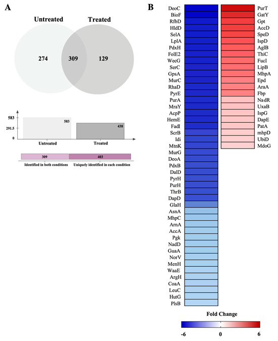 Proteomic analysis of K. pneumoniae NH54 responding to treatment with Miang extract. (A) Venn diagram showing number of proteins identified from untreated and treated conditions. (B) Heatmaps of unique significantly regulated proteins.