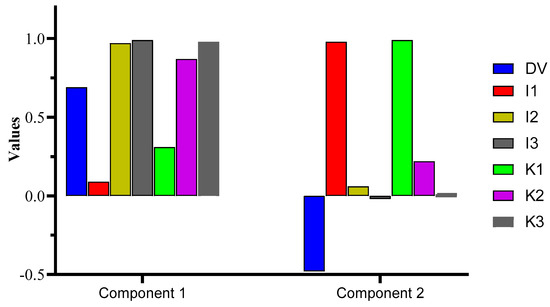 The principal component analysis (PCA) exhibited a cumulative variance of 90.52%, where PC1 computed the major variance of 58.82%, followed by PC2 (31.70%). Interestingly, PC1 was loaded with DV, I2, I3, K2, and K3, whereas I1 and K1 were loaded in PC2. The outcome confirms Pearson’s test data, i.e., a greater correlation was observed for DV vs. the I2, I3, K2, and K3 samples, which is confirmed herein by the greater variance in the data shown by the mentioned samples vs. DV. The test was significant at p = 0.05, with a high X2 value of 141.33. The % variance for the components with detailed data regarding the KMO and Bartlett’s test is shown in Figure 3 and Table S4.