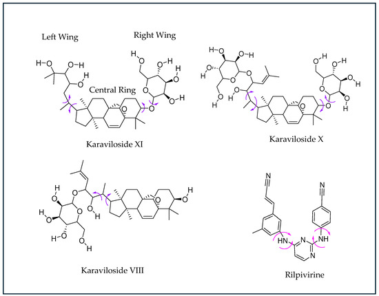 Chemical structures of NNRTI Rilpivirine (RPV). The torsion angles defining the rotatable bonds are labeled using purple-colored arrows in Karaviloside VIII, X, and XI. The equivalent torsion angle RPV is labeled using magenta-colored arrows. The structures of karavilosides, apart from karaviloside VIII, can be divided into three functional regions—a steroidal central ring, a hexose sugar/ethylene glycol left wing, and a hexose sugar right wing.