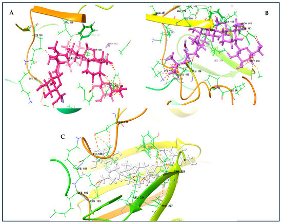 The KVs exhibited an impressive structural complementarity to the non-nucleoside inhibitor-binding pocket (NNIBP). Moreover, KV-X and -XI (left-wing structures of these compounds) interact with GLU138, LYS103, VAL106, VAL179, and LEU100 through van der Waals (VDW) interactions. The presence of the steroidal ring (center) enables the establishment of Pi and non-polar interactions with Phe227 and LEU234. Likewise, the right wing for these compounds interacts with TYR181, TYR188, and MET230 (Figure 5A,B). For KV-VIII, less interaction was observed with the non-nucleoside inhibitor-binding pocket (Figure 5C). The variation in affinity and bindings may be due to the absence of the third functional region compared to KV-X and -XI. A superior binding affinity for the protein binding based on the Pi and non-polar interactions with GLU138, LYS103, VAL106, VAL179, and LEU100 have been reported for KV-XI [26].