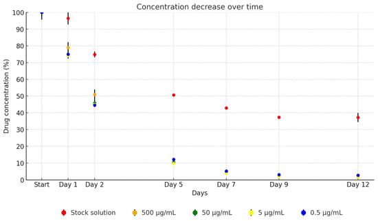 In our study, no significant difference was observed in the stability of cefotaxime between its UPW solution and the TSB dilution series. For the dilutions, the detectable drug concentration after one day averaged 72.7% of the initial concentration, dropping to 43.7% by the second day, 13.1% by the fifth day, 8.2% by the seventh day, 4.8% by the ninth day, and finally to 3.6% by the twelfth day, as illustrated in Figure 2. Over the 12-day period, the concentration of the antibiotic active ingredient in the stock solution decreased to 2.0% of its original level (from 4762.10 µg/mL to 95.05 µg/mL). The dilutions showed similar reductions: to 2.0% (from 511.97 µg/mL to 10.25 µg/mL), to 1.8% (from 54.59 µg/mL to 0.98 µg/mL), to 1.4% (from 5.6 µg/mL to 0.8 µg/mL), and to 10.3% (from 0.58 µg/mL to 0.06 µg/mL).
