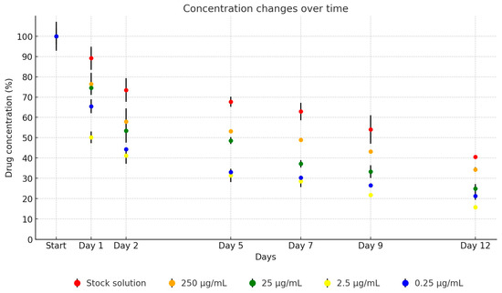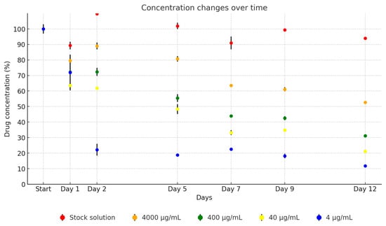 The neomycin stock solution exhibited relative stability throughout the study. However, when averaged across the dilutions in TSB, a notable degradation of the active substance was observed over time. After just one day of incubation, only 71.8% of the active ingredient remained on average, with a consistent average decrease of 10% per subsequent measurement. By the conclusion of the testing period, the remaining concentration of the original drug averaged at 29.2%, as demonstrated in Figure 7. Over the 12-day period, the concentration of the antibiotic active ingredient in the stock solution decreased to 93.3% of its original level (from 43,472.35 µg/mL to 40,552.25 µg/mL). The dilutions showed the following reductions: to 52.6% (from 4354.81 µg/mL to 2289.46 µg/mL), to 31.1% (from 409.3 µg/mL to 127.36 µg/mL), to 21.7% (from 35.69 µg/mL to 7.75 µg/mL), and to 11.8% (from 2.2 µg/mL to 0.26 µg/mL).