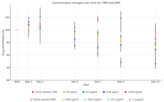 Sulfamethoxazole exhibited a similar pattern, with its UPW solution maintaining stability until a marginal reduction to 98.8% was noted on day 12. The TSB dilutions mirrored the trend observed with trimethoprim, starting to decline on day 5 (97.4%) and averaging at 90.3% of the initial concentration by day 12, as depicted in Figure 8. Over the span of 12 days, the antibiotic active ingredient concentration in the stock solution decreased to 99.2% of its initial level (from 19,573.0 µg/mL to 19,407.56 µg/mL). The dilutions showed reductions as follows: 94.6% (from 2002.74 µg/mL to 1895.02 µg/mL), 9.5% (from 201.86 µg/mL to 190.82 µg/mL), 89.8% (from 21.13 µg/mL to 18.98 µg/mL), and 81.6% (from 2.56 µg/mL to 2.09 µg/mL).