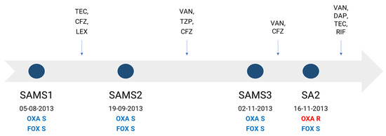 Antibiotic therapy received by the patient and dates of recovery of each S. aureus isolate. Antimicrobial therapy is represented above the timeline. OXA, oxacillin; FOX, cefoxitin; TEC, teicoplanin; CFZ, cefazolin; LEX, cephalexin; TZP, piperacillin/tazobactam; VAN, vancomycin; DAP, daptomycin; RIF, rifampin; S, susceptible (blue); R, resistant (red).