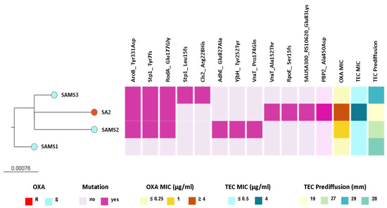 In this work, we aimed to characterize the molecular mechanisms associated with the development of oxacillin resistance in a clinical S. aureus strain lacking the mec gene and recovered during the course of antibiotic treatment from a 61-year-old male suffering successive episodes of bacteremia. The patient was admitted to the hospital for the placement of a stent, after which he developed a superficial vein thrombosis in a peripheral line, with a positive culture for methicillin-susceptible S. aureus (MSSA), SAMS1. He received treatment with teicoplanin, cefazolin and cephalexin successively. Forty-five days later, the patient was readmitted due to sepsis without a clear focus. A second MSSA isolate (SAMS2) was recovered from his blood cultures, and he started treatment with vancomycin and piperacillin/tazobactam, later switching to cefazolin until completing 6 weeks of antibiotic treatment. A few days after finishing the treatment, the patient was again readmitted with fever and a third MSSA isolate (SAMS3), and the same antibiotic susceptibility profile as SAMS1 was recovered from 2/2 blood cultures. The patient started treatment with vancomycin and cefazolin. After 14 days, an oxacillin-resistant cefoxitin-susceptible S. aureus isolate without any other accompanying resistance (SA2) was recovered from 2/2 blood cultures (Figure 1). The patient received treatment with vancomycin, daptomycin and teicoplanin, which were successively associated with rifampicin; this treatment was completed 6 weeks after the last positive blood culture, evolving favorably.