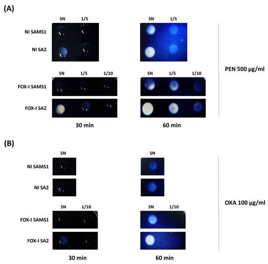 For the iodometric method, starch agar plates (0.25 g of starch (Sigma Aldrich, St. Louis, MO, USA), 0.50 g of Agar-Agar (Britania, Buenos Aires, Argentina), 50 mL of 50 mM phosphate buffer pH: 7.5, and 1 mL of a potassium iodide–iodine solution) were prepared with OXA (100 μg/mL), FOX (100 μg/mL) or PEN (500 μg/mL), all from Sigma Aldrich, St. Louis, MO, USA. The plates were then inoculated with 50 μL of undiluted supernatant (45 mg total proteins) and serial dilutions of supernatants, and incubated at 37 °C for 60 min. The presence of β-lactamases in the culture supernatant causes the discoloration of the agar as a consequence of the acidification of the medium upon β-lactam hydrolysis [62]. The progress of the reaction was monitored at 30 and 60 min, and pictures were taken at each time point.