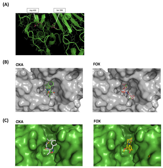 The PBP2 surface patterns of SA2 were also obtained in association with oxacillin and cefoxitin molecules, showing the apparent difficulty of accommodating oxacillin in the active site cavity of the transpeptidase, unlike cefoxitin (Figure 6B and Figure S2). Surface models of SA2 PBP2 with covalently bound oxacillin and cefoxitin also evidenced the difficulty of the oxacillin molecule interacting with SA2 PBP2 (Figure 6C).
