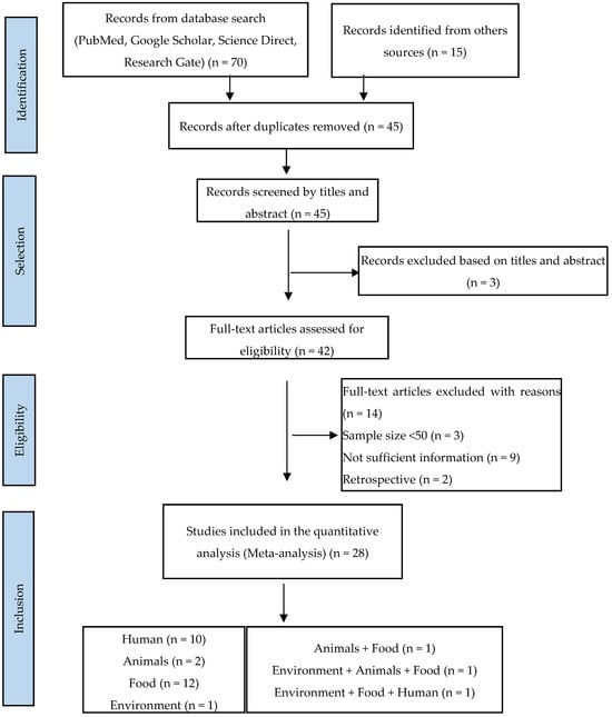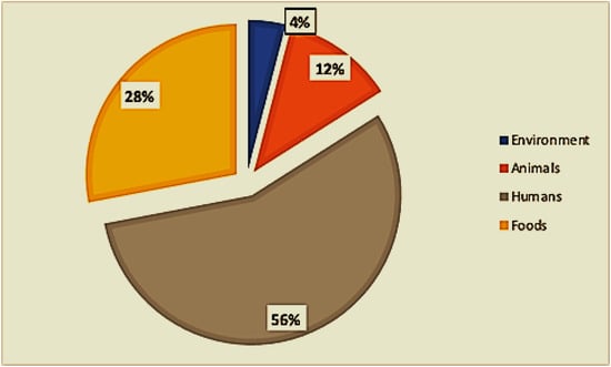 Of the twenty-eight included studies, twelve (12) were from food sources, eleven (11) were from clinical sources (mainly children under 5 years of age), two (02) were from animal sources, one (01) was from environmental sources, and one (01) included both animal and environmental sources (Figure 3). One study examined food, human, and environmental hosts, and one study included hosts of both food and animal origin (Figure 1).