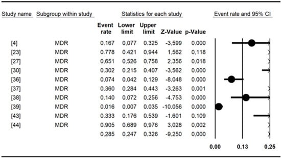 Forest plot showing the pooled estimates of multidrug resistance in studies conducted in Burkina Faso.
