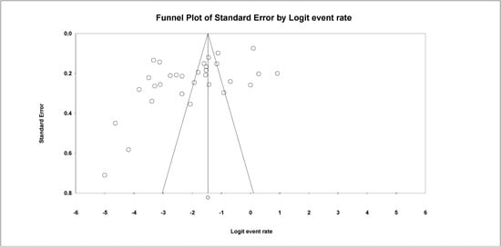 - Egger, M.; Davey Smith, G.; Schneider, M.; Minder, C. Bias in meta-analysis detected by a simple, graphical test. BMJ 1997, 315, 629–634. [Google Scholar] [CrossRef]