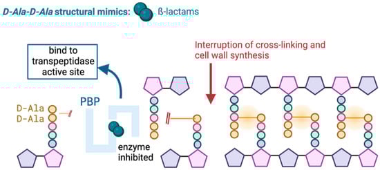 Carbapenems, like other β-lactam antibiotics, act by inhibiting the synthesis of the peptidoglycan of the bacterial cell wall. This occurs through irreversible binding of the β-lactam to penicillin-binding proteins (PBP) at the active site of the transpeptidase, where typically the terminal amino acid residues would bind, leading to the death of the cell wall (Figure 1) [,].