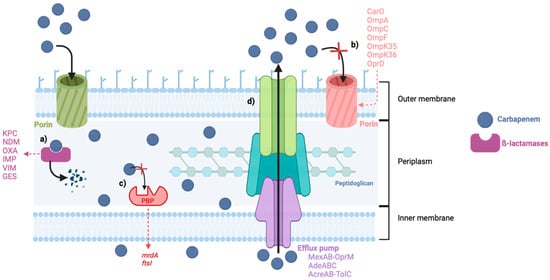 The production of carbapenemases represents the main mechanism of carbapenem resistance and, alongside carbapenems, is capable of hydrolyzing other β-lactam antibiotics such as penicillin, cephalosporins, and aztreonam [].
