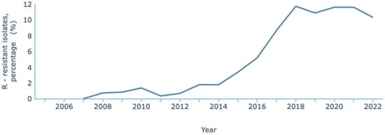The spread of carbapenemase-producing bacteria has been increasing considerably through the years []. Among the European countries, Portugal is a country where the carbapenem resistance remains high and with specific concerns, such as the increase of the carbapenem-resistant Klebsiella pneumoniae (10.29% in 2022) [,].
