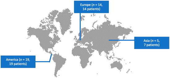 The literature search yielded 133 studies. After screening all potentially eligible articles and assessing the references of the included articles, only 38 studies met the inclusion criteria and were considered for data extraction [5,6,7,8,9,10,11,12,13,14,15,16,17,18,19,20,21,22,23,24,25,26,27,28,29,30,31,32,33,34,35,36,37,38,39,40,41,42]. These 38 studies provided information on 40 patients. Among them, 19 studies were conducted in North and South America, 14 in Europe, and 5 in Asia. There were 37 case reports and 1 case series. Figure 1 shows a graphical representation of the geographical distribution of the published cases. Table 1 shows the characteristics of the included studies in the present review.