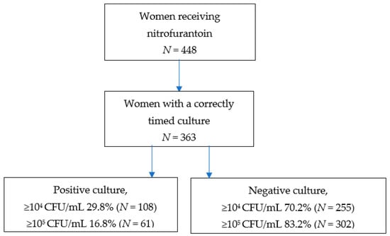 In case of a cut-off of ≥105 CFU/mL, in 16.8% of the correctly timed urine samples, the culture was positive in women who received nitrofurantoin. With a cut-off of ≥104 CFU/mL, the percentage of positive urine samples was 29.8% in women who received nitrofurantoin (Figure 1).