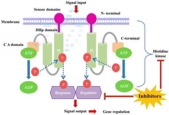 TCSs are considered appealing antibacterial targets because they are conserved in almost all bacterial species. In addition, the TCS is and involved in the regulation of a number of processes connected to bacterial pathogenicity, virulence, biofilm development, antibiotic resistance, and bacterial persistence. Although crucial for bacterial adaptability and fitness, only a few of these TCSs are considered essential for bacterial cell survival. However, some TCSs are not essential for bacterial survival in laboratory environments, but they enhance bacterial fitness by enabling adaptation to environmental changes. Certain responses are expressed by pathogenic bacteria in response to their host environment, and these responses typically rely on the TCS system. Another important consideration is the difference between targeting essential and nonessential TCSs in pathogens. Essential TCSs are essential for the survival and growth of bacteria. While inhibiting TCSs can efficiently kill or suppress bacteria, it can also lead to the swift development of resistance, as bacteria are under strong selective pressure to survive. On the other hand, nonessential TCSs often regulate virulence factors rather than basic survival. By targeting these systems, we can reduce the pathogen’s ability to cause disease without necessarily killing it, which may result in slower resistance development. For example, studies have shown that targeting the Agr system in Staphylococcus aureus, which is not essential for survival but crucial for virulence, can significantly diminish its ability to cause infections without inducing rapid resistance [21,22]. This approach could offer a more sustainable way to manage bacterial infections. TCS signaling involves autophosphorylation of a membrane-bound BHK, phosphotransfer of the phosphoryl group to a cognate response regulator (RR), and ultimately modulation of the expression of target genes (Figure 1) [23]. BHKs are present in both essential and nonessential TCSs. Appropriate phosphorylation levels of RR are tightly regulated by the phosphatase activity of BHK, RR, or a partner protein [23,24]. BHK autophosphorylation is mediated via the catalytic and ATP-binding (CA) domain, which binds ATP and phosphorylates BHK at a conserved histidine residue in the dimerization and histidine phosphotransfer (DHp) domain. The CA and DHp domains are conserved and present in all HKs, whereas the remaining sensor domains (periplasmic, PAS, GAF, HAMP) are variable and not present in all HKs [23].