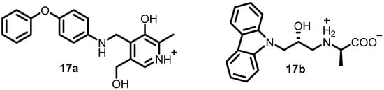 In 2010, to identify potent inhibitors of BHK, Henriksen et al. performed virtual screening of a library containing approximately 106 compounds. Forty-nine compounds were found to exhibit potent inhibitory activity, and among them, eighteen compounds were directly evaluated against three different S. aureus strains and two E. coli strains via disk inhibition assays. Compounds 17a and 17b (Figure 18) were the most potent, with G-score values of −7.70 and −7.68 kcal/mol, respectively, and MM-GBSA values of −20.34 and −20.53 kcal/mol, respectively. These compounds can be further optimized for the development of future antibacterial agents [57].