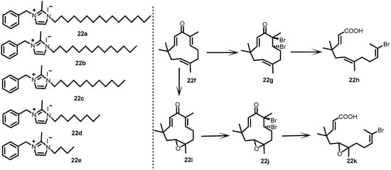 Chemical structures of imidazole derivatives 22a–22e and zerumbone derivatives 22f–22k.