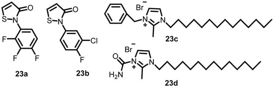 In 1993, Roychoudhury et al. identified compounds that prevent the phosphorylation or dephosphorylation of AlgR2 and the DNA-binding activity of AlgR1, which prevent the production of the alginate gene. In this study, 15 compounds were shown to be effective in screening approximately 25,000 compounds for the inhibition of algD promoter activation. Furthermore, four (23a–23d) (Figure 23) of fifteen compounds strongly inhibited AlgR1-AlgR2 phosphorylation, AlgR2 kinase activity, AlgR2 phosphatase activity, the DNA-binding activity of AlgR1, and the kinase activities of CheA, NRⅡ, and KinA [41].