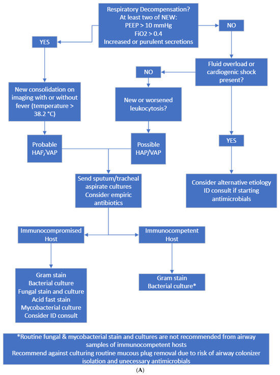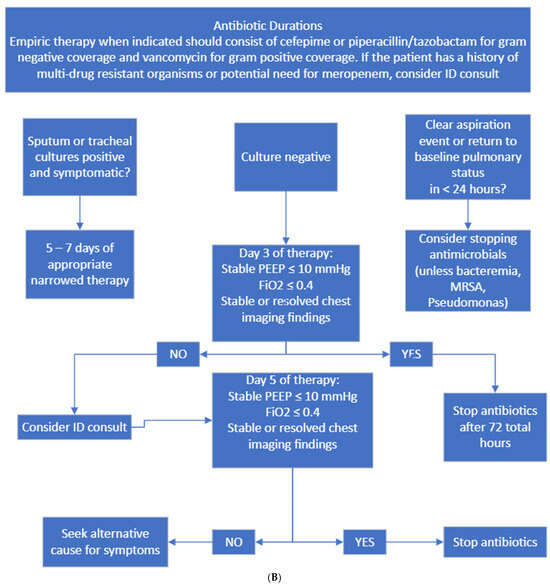 The stakeholders created an agreed-upon set of criteria for diagnostic accuracy, culture attainment (Figure 2A), and treatment regimens and durations for HAP/VAP (Figure 2B). A multidisciplinary group of CVS, critical care, anesthesia, infectious diseases, IPAC, and antimicrobial stewardship clinicians apart from the initial stakeholders were consulted, and the protocol was modified based on their input. These included physicians, nurses, pharmacists, and advanced practice providers. The final recommendations were collated from multiple sources, including guidelines and primary literature [2,15]. The proposed protocol was retrospectively assessed during July–December 2022. Patients eligible for inclusion were similar to the preliminary phase, including prescription of antibiotics with an indication of respiratory tract infection, not admitted for immediate post-heart or -lung transplant care, and not experiencing another infection source. The primary goal was assessing diagnostic accuracy and treatment accuracy.
