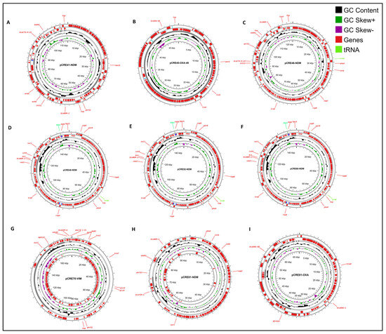 Circular maps of plasmids isolated from Enterobacter hormaechei isolates. This figure represents the circular maps of plasmids pCRE41-NDM (A), pCRE45-OXA-48 (B), pCRE46-NDM (C), pCRE48-NDM (D), pCRE52-NDM (E), pCRE60-NDM (F), pCRE70-VIM (G), pCRE81-NDM (H), and pCRE81-OXA (I). Annotations include GC content (black), GC Skew+ (green), GC Skew- (purple), Genes (red), and tRNA (light green). The plasmids contain several resistance genes: pCRE41-NDM (A) includes blaNDM1, blaCTX-M-15, qnrS1, and aadA1; pCRE45-OXA-48 (B) includes blaOXA-48; pCRE46-NDM (C) includes blaNDM1, blaCTX-M-15, qnrS1, and aadA1; pCRE48-NDM (D), pCRE52-NDM €, and pCRE60-NDM (F) include blaNDM1, rmtC, sul1, and dfrA14; pCRE70-VIM (G) includes blaVIM-4, mphA, sul2, cmlA5, and aac(6’)-II; pCRE81-NDM (H) includes blaNDM-1, blaTEM-1, qnrS1, and aadA1; and pCRE81-OXA (I) includes blaOXA-48, blaOXA-1, and dfrA14. The outermost ring shows the annotated genes, while the inner rings display GC content and GC skew.