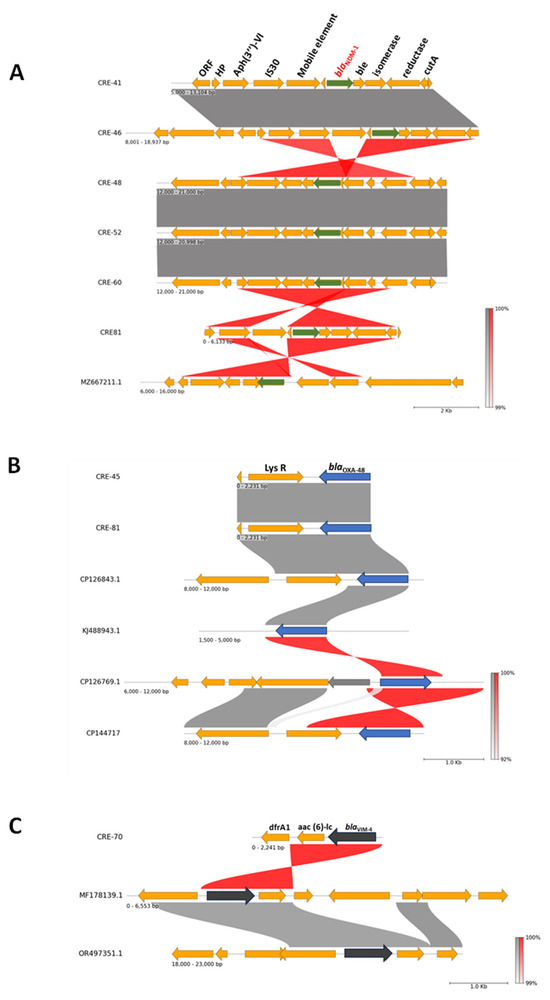 Additionally, the analysis highlighted similarities among isolates harboring the blaOXA-48 gene, where it is consistently associated with the presence of a transcriptional regulator (LysR), as depicted in Figure 3B. Regarding blaVIM-4, the genetic comparison revealed that this gene in CRE70 co-locates with the aminoglycoside resistance gene (aac(6′)-lc), a pattern also observed in other isolates. Furthermore, this genetic cassette includes an additional resistance gene encoding for trimethoprim resistance (dfrA1), underscoring the complexity of the resistance mechanisms in this particular isolate (Figure 3C).