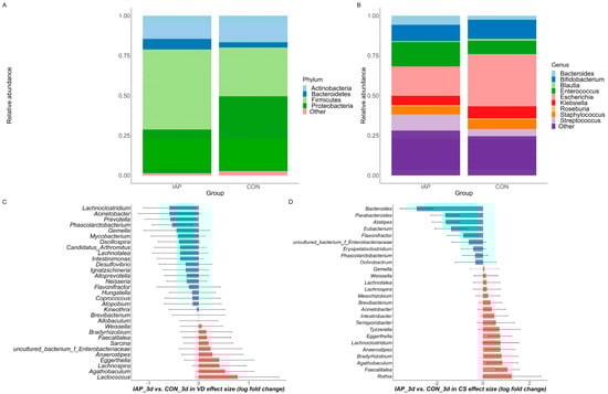 Relative abundance of gut microbial communities at the phylum level (A) and genus level (B) in the first three days. Waterfall plot of differentially abundant genus in the neonate microbiota derived from the ANCOM-BC model, representing beta values (log-fold change) by (C) vaginal delivery (VD) and (D) cesarean section (CS) after birth. The X-axis represents the log-fold change in beta values in the differential abundance of taxa in the IAP group versus the CON group, while the Y-axis represents differentially abundant taxa at the genus level. All effect sizes were adjusted by the Bonferroni method (q < 0.05). Taxa represented by blue bars are abundant in the IAP group, while those represented by red bars are abundant in the CON group. Statistical significance was determined at the p < 0.05 and p < 0.001 levels. VD, vaginal delivery; CS, cesarean section; IAP, intrapartum antibiotic prophylaxis; CON, use neither antibiotics nor probiotics.