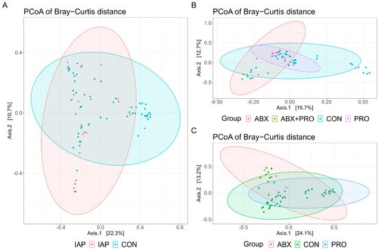 PCoA analysis of Bray–Curtis distance regarding the difference in the microbial community composition in the first three days (A), at two months (B), and at six months (C) of age (PERMANOVA with 9999 permutations, all p > 0.05). PERMANOVA, permutational multivariate analysis of variance.