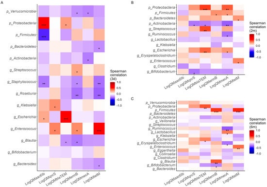 Correlation heatmaps between the log quality mean value of six ARGs and top microbiota at the phylum and genus level in the first three days (A), at two months (B), and at six months of age (C). The R–value is depicted using distinct colors. Additionally, the significance level is denoted by asterisks (*, **, and ***) to indicate that the correlation is significant at the 0.05, 0.01, and 0.001 levels, respectively.