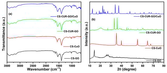(a) FT-IR and (b) XRD spectra of CS-GO, CS-CuO, CS-CUR-GO, and CS-CUR-GO/CuO composites.