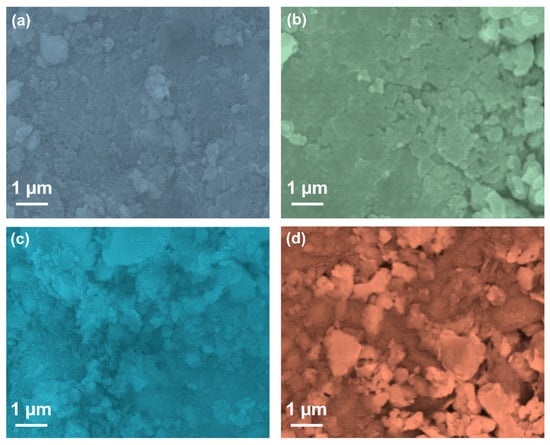 To elaborate on the surface properties of the prepared composites, scanning electron microscopy (SEM) analysis was performed. Figure 2a–d depict the SEM images of the CS-GO, CS-CuO, CS-CUR-GO, and CS-CUR-GO/CuO nanocomposites. The CS-GO composite produces nano-sized grain bunches comprised of various shapes of fibre-like wrinkled grains, which might be formed by the GO interaction with CS, as shown in Figure 2a. In the case of the CS-CuO composites (Figure 2b), the conglomerated grains are observed due to the strong interaction of CS with CuO particles. When the CUR is decorated on the CS-GO nanograins, the granular, irregular-shaped grains are observed with agglomeration for the CS-CUR-GO composite (Figure 2c). Figure 2d shows the SEM image of the CS-CUR-GO/CuO composite. The well-dispersed grains with inhomogeneous shapes and sizes of domains are observed. The prepared CS-CUR-GO/CuO composite consists of granular particles, along with bumped grains, which depict the enriched surface area and highly interacted grains in the resulting nanocomposites. Supplementary Materials Figure S2a–d shows the particle size analysis profiles of the CS-GO, CS-CuO, CS-CUR-GO, and CS-CUR-GO/CuO nanocomposites, respectively. The observed profile reveals the different sizes of nanoparticles in the prepared composites. The CS-CUR-GO/CuO hybrid composite exhibits a large number of grains exhibiting a 50 nm size. From the observation of various composite surfaces, the CS-CUR-GO/CuO hybrid composite provides enriched characteristics and a better morphological nature than the other intermediates.