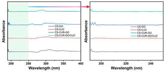 The optical properties of the prepared composites were deliberately defined by the UV-Vis spectroscopy results. Figure 3 shows the UV-Vis spectral results of the prepared CS-GO, CS-CuO, CS-CUR-GO, and CS-CUR-GO/CuO nanocomposites between the range of 190 nm and 400 nm. The absorption profile reveals the peak between the 200 and 220 nm wavelengths owing to the existence of carbonyl groups in the resulting nanocomposites []. For CS-CuO, the absorption edge is slightly shifted to the blue region []. However, the shifting of the optical absorption edge towards the higher wavelength region is observed for the CS-CUR-GO nanocomposite. The observation of a red shift in the optical absorption edge is credited to the exhibiting of GO trapping in chitosan fibres. In the case of the CS-CUR-GO/CuO nanocomposite, the absorption edge is slightly moved towards the lower region due to the coexistence of CuO with CS-CUR-GO [].