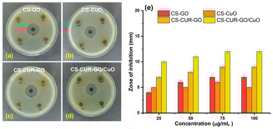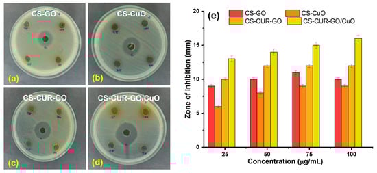 Antibacterial activities of (a) CS-GO, (b) CS-CuO, (c) CS-CUR-GO, and (d) CS-CUR-GO/CuO nanocomposites against Gram-positive S. aureus bacterial organisms and (e) their zone of inhibition.