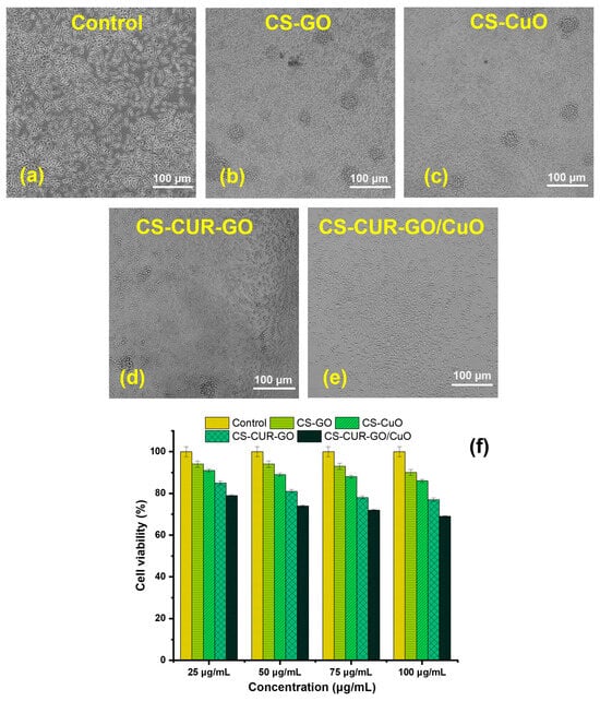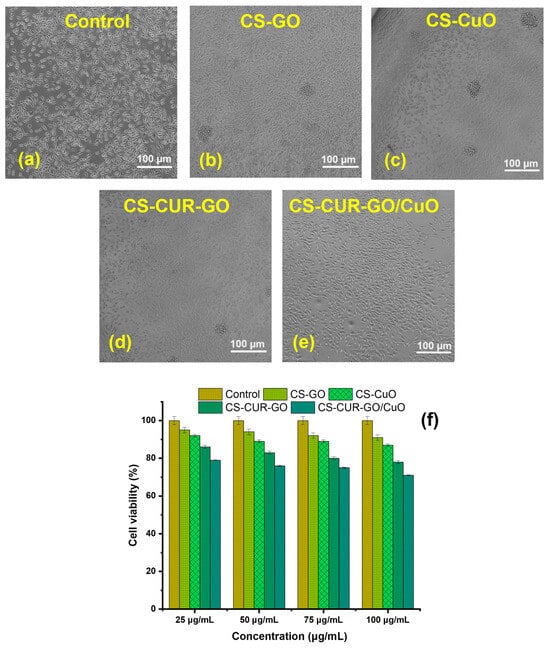 Cytotoxcity of mouse fibroblast cells at 24 h using (a) control, (b) CS-GO, (c) CS-CuO, (d) CS-CUR-GO, and (e) CS-CUR-GO/CuO hybrid nanocomposites and (f) their cell viability.