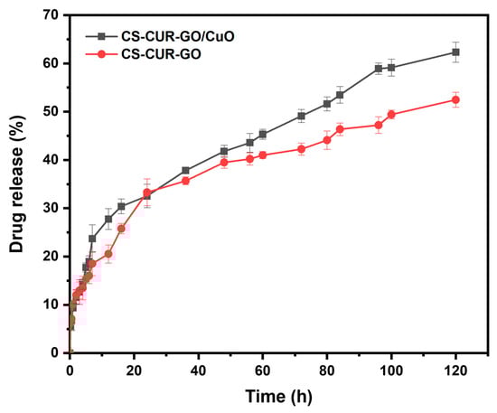 Figure 8 depicts the drug-releasing effectiveness of CS-based nanocomposites. The loading effectiveness and drug release profile of CUR in PBS have been studied using the optimum settings. According to the findings, increasing the quantity of CS-CUR-GO/CuO nanocomposite allows the incremental loading and trapping of CUR with bulk-sized nanoparticles. The observation exhibits the zero-order kinetics of drug release for the prepared composites. Furthermore, larger curcumin concentrations limit the drug precipitation. Figure 8 indicates that CUR release is gradual and regulated at first, then becomes persistent. However, the release curves at 12 h show 21% and 28% increases from the CS-CUR-GO and CS-CUR-GO/CuO nanocomposites, respectively. In neutral pH, the delayed release causes a repulsive force between the positively charged CS polymer, causing it to swell. After 24 h, an equal proportion (33%) of drug diffused out of the CS-CUR-GO and CS-CUR-GO/CuO nanocomposites. On the contrary, an uneven diffusion rate was detected in the latter phase of CS-CUR-GO, whereas the CS-CUR-GO/CuO nanocomposite demonstrated considerable controlled and sustained drug release. Thus, the CS-CUR-GO/CuO nanocomposite with a release profile of 62% at 120 h is a promising nano-formulation for various controlled drug delivery applications.