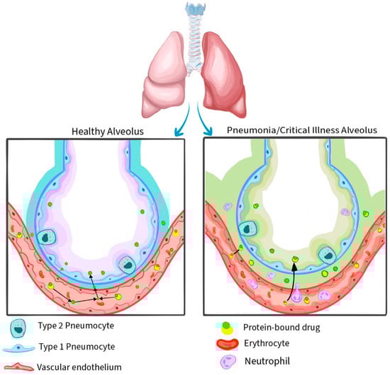 - Increased pulmonary vascular endothelium and alveolar epithelium permeability in critical illness alters drug distribution and equilibration [,].