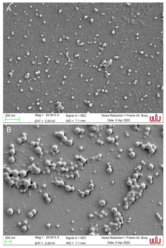 The SEM images of CS-AuNPs (A) and Col-CS-AuNPs (B).