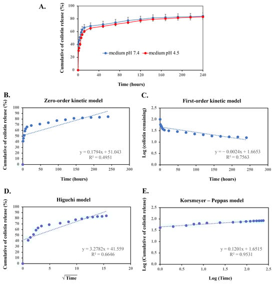 Cumulative colistin release (%) from Col-CS-AuNPs over ten days (A). Colistin release from Col-CS-AuNPs was fitted to kinetic models (B–E). Colistin release was fitted to each kinetic model: zero-order kinetic model by plotting cumulative % drug release vs. time (B), first-order kinetic model by plotting the logarithmic value of the remaining percent drug release vs. time (C), simplified Higuchi model by plotting cumulative % drug release vs. the square root of time (D), and Korsmeyer–Peppas model by plotting the log-cumulative % drug release vs. log time (E). The Korsmeyer–Peppas model showed a high correlation with R2 > 0.95. Dots represent the drug released at a specified time point, and the dashed line represents the regression line, as shown in each graph.